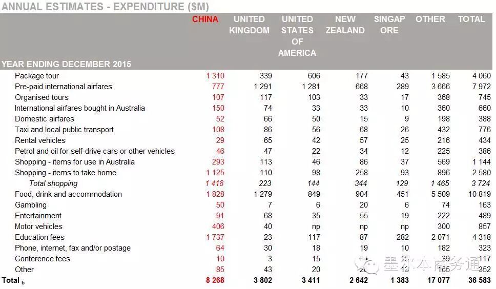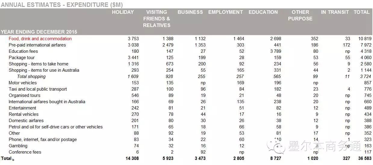 分消费领域看,国际旅客在澳消费支出主要集中在①饮食住宿(Food, drink and accommodation,108.2亿澳元)、②预付国际机票(Pre-paid international airfares,79.7亿澳元)、③旅游套餐(Package tour,40.6亿澳元)、④归国礼品购物(Shopping - items to take home,25.8亿澳元)、⑤在澳消费物品(Shopping - items for use in Australia,11.4亿澳元)、⑥租车(Motor vehicles,8.6亿澳元)、⑦交通费用(Taxi and local public transport,7.8亿澳元)等领域。此外,以教育培训旅客为主消费群的学费支出(Education fees)亦达到43.2亿澳元。