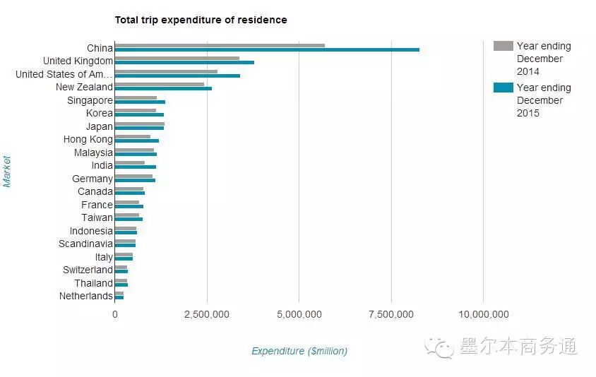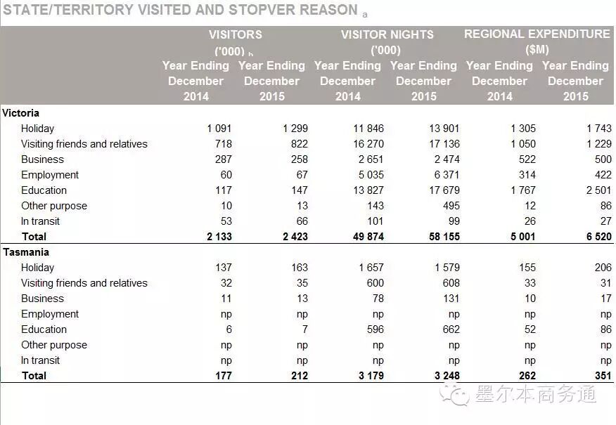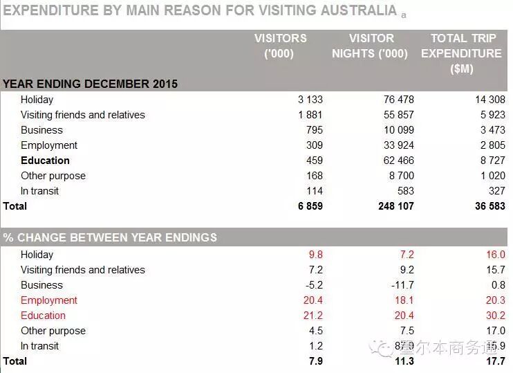 分旅客类型看,2015年上述7类旅客到访澳洲数量分别为313.3万人次、188.1万人次、79.5万人次、30.9万人次、45.9万人次、11.4万人次、16.8万人次。其中,因教育培训来澳的旅客在2015年内增长最为显著,访问人次同比增长21.2%;平均居澳天数为136晚,同比增长20.4%;尤其是在澳消费支出(含学费及生活费等)同比增幅达30.2%,增至87.3亿澳元。同期,因旅游度假来澳的旅客313.3万人次,消费支出143.1亿澳元,同比分别增长9.8%和16%,平均旅澳天数为24晚;因探亲访友来澳的旅客188.1万人次,消费支出59.2亿澳元,同比分别增长7.2%和15.7%,平均旅澳天数为30晚。