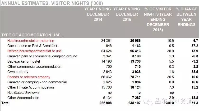 从旅居方式看,2015年国际旅客在澳共居留2.48亿晚,人均36晚。最主要方式是租房(Rented house/apartment/flat or unit)、暂居亲友住所(Friends or relatives property)及入住酒店度假村(Hotel/resort/motel or motor Inn),分别占到总体的38.9%、30.5%和10.5%。其中,酒店度假村的入住天数达2599万晚,较上年同比增长6.7%,与此同时,据测算,旅游度假(Holiday)类国际旅客平均每天消费187澳元,同比增长8.1%。两项数据呈现出国际旅客对澳洲中高端酒店和度假村的持续增长需求。