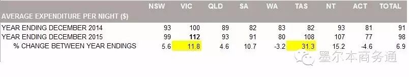 旅客日平均消费也呈快速增长态势,尤其以塔州最为明显,国际旅客日消费支出从2014年度的82澳元增至2015年度的108澳元,同比增幅达31.3%,增速为各州之首;而维州作为文化、体育、节庆汇聚的高端旅游目的地,也吸引了大量高价值的国际旅客,2015年旅客日消费支出112澳元,该指标继续保持各州第一的位置。
