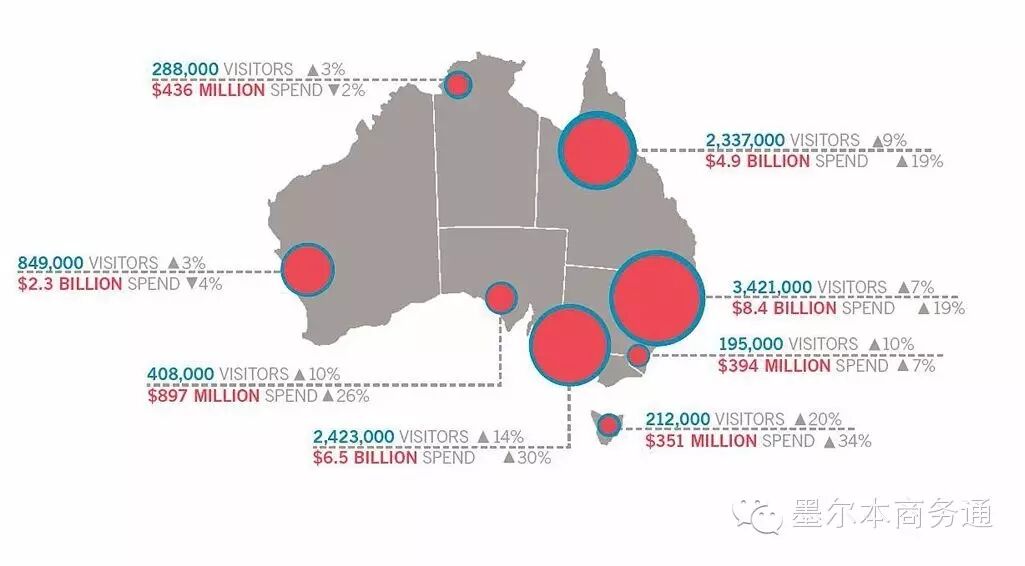 在到访旅客量不断增多的同时,国际旅客在维州、塔州当地消费支出的增长也十分显著。2015年,国际旅客在维州、塔州共花费65.2亿澳元和3.5亿澳元,分别同比增长30.4%和34.1%,均远超其它州水平,并高于整体增速(18.9%)10个百分点。