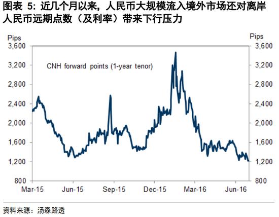但尤其自2015年8月人民币汇改以来,离岸人民币市场总体疲软。尽管离岸-在岸价差在过去几个月收窄,离岸价仍总体弱于在岸价(美元/离岸人民币汇率高于美元/在岸人民币)。此,在由市场驱动的一般关系下,应出现由境外向境内的人民币净流入。