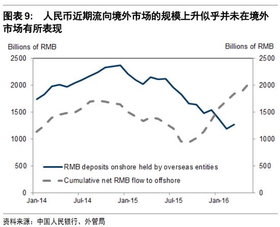 更大范围内,境外机构持有的境内人民币存款(包括境外银行存放在境内银行的离岸人民币)近期显著背离了截至目前与人民币由境内到境外累积净流出同步的模式,且后者在绝对水平上甚至超过了前者(图表9)。