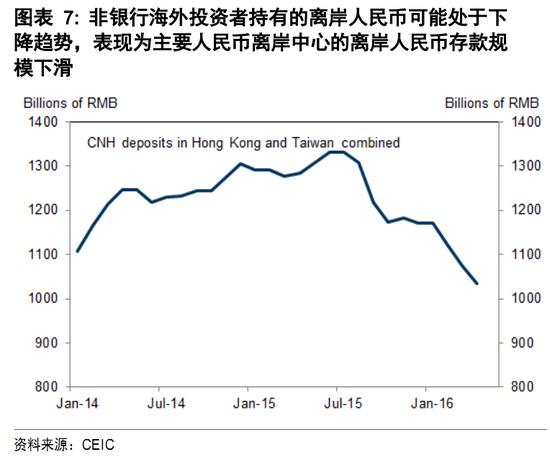 另外耐人寻味的是,人民币向境外市场的这一大规模净流出似乎并未体现在境外投资者持有的离岸人民币资产上。总体而言,如果人民币流入境外非银机构,则可能成为离岸人民币存款;如果流入境外银行,则应成为这些银行的新增离岸人民币资产。但在人民币两大离岸中心的香港和台湾,离岸人民币存款规模在过去几个月持续下降(图表7);